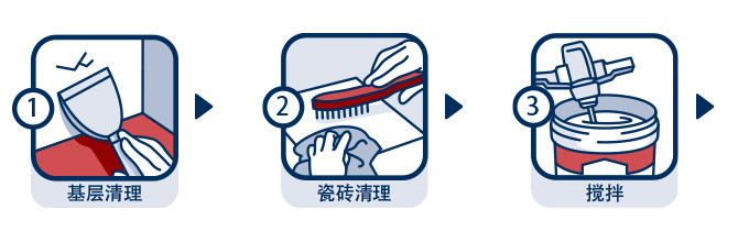 | 施工事項: | 瓷磚背面應干燥且無浮灰。在開放時間(一般為20分鐘)內完成瓷磚的揉壓粘貼。禁止無縫貼磚,磚縫不小于2mm。建議使用齒刮刀在基層與瓷磚背面同時薄刮瓷磚膠粘劑進行雙面涂膠。攪拌好的膠漿須在2小時內用完。 |